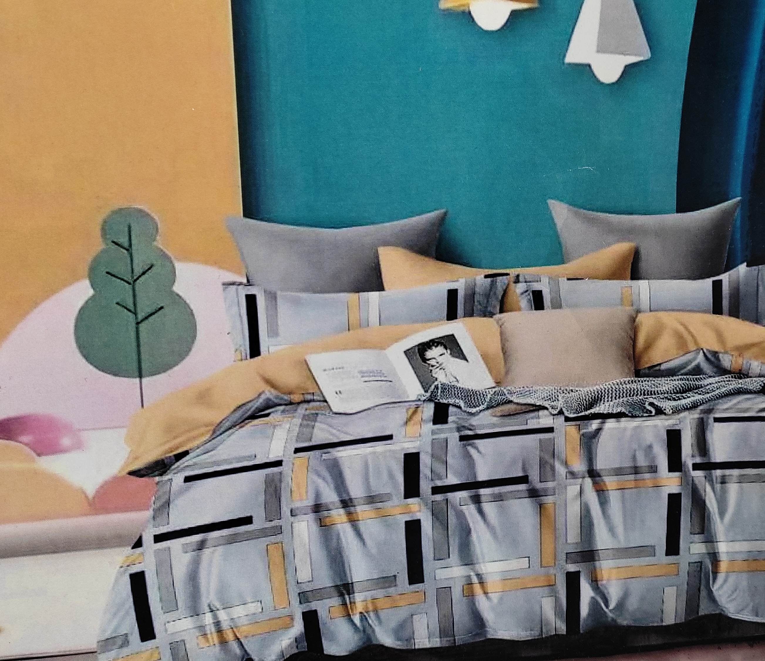 Premium 4-piece cotton comforter set in blue-grey geometric grid print with golden pillow covers. Includes 1 comforter, 1 bedsheet & 2 pillow covers.