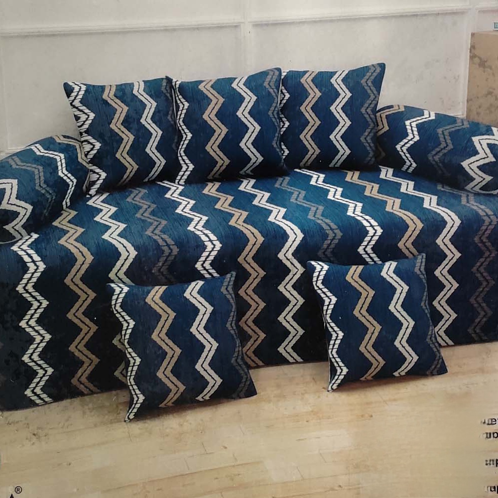 Make a bold style statement with this striking Navy Blue Zigzag Chevron Cotton Diwan Set. Featuring a dramatic chevron zigzag pattern in deep navy blue, warm gold, and crisp white, this 8-piece set instantly transforms your diwan into a stylish focal point. Crafted from soft, breathable cotton — comfortable for everyday use in all seasons.